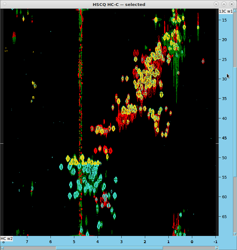 - This time the HC axis is folded by 1/4*SW, with no additional offset. To match with HC-C HSQC (data/AIffinity_2024/13) the HC axis can be shifted in Sparky by this amount: -(11.9037/4) = -2.976 ppm.