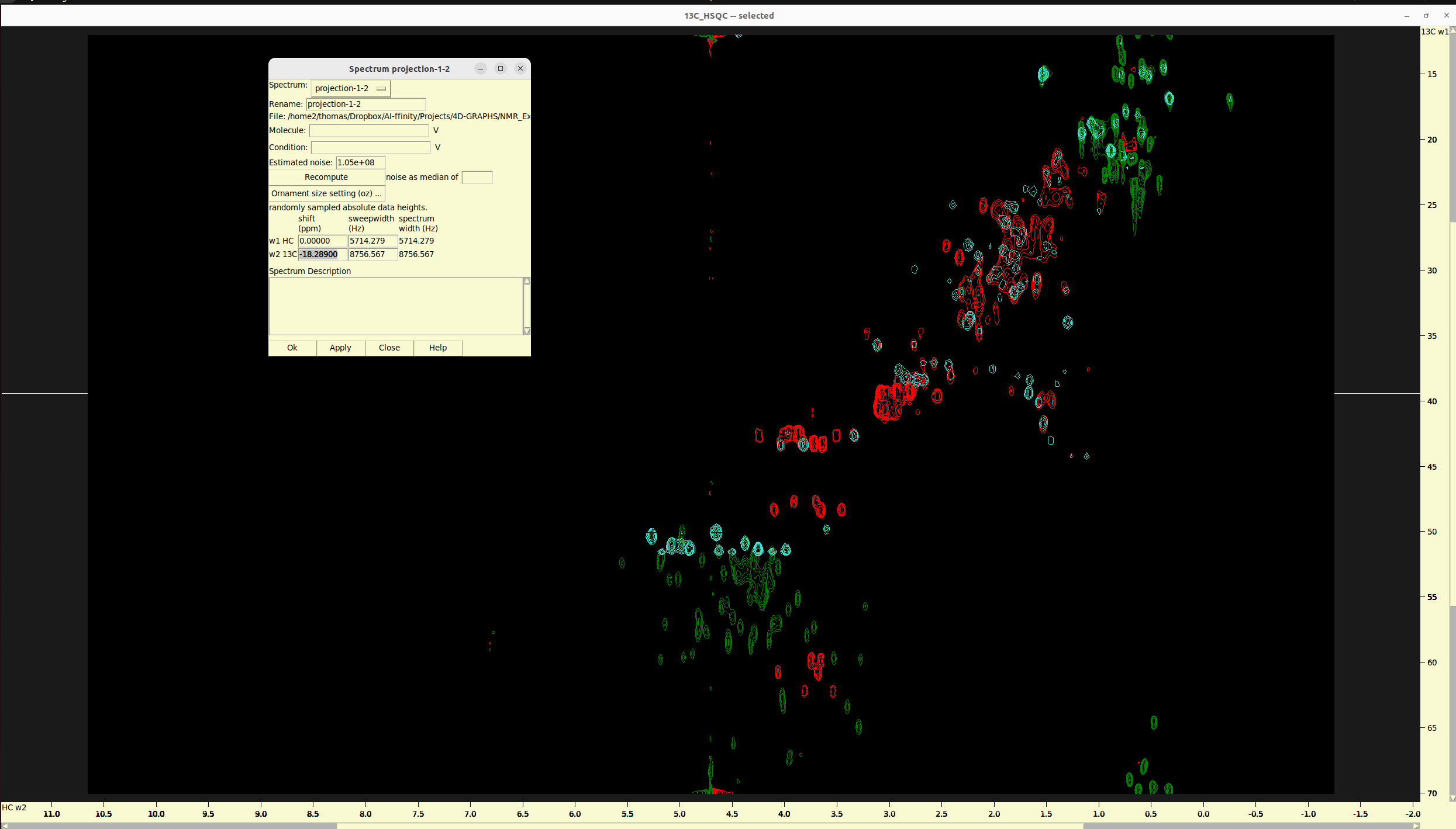 ucsfdatacommand line utility from Sparky to rename them accordingly. - load the 2D projection and the 13C HSQC to Sparky.